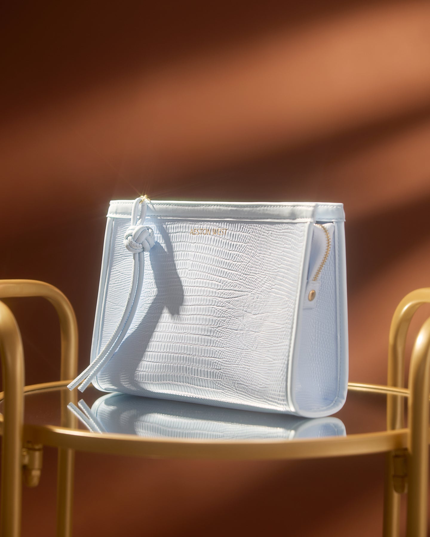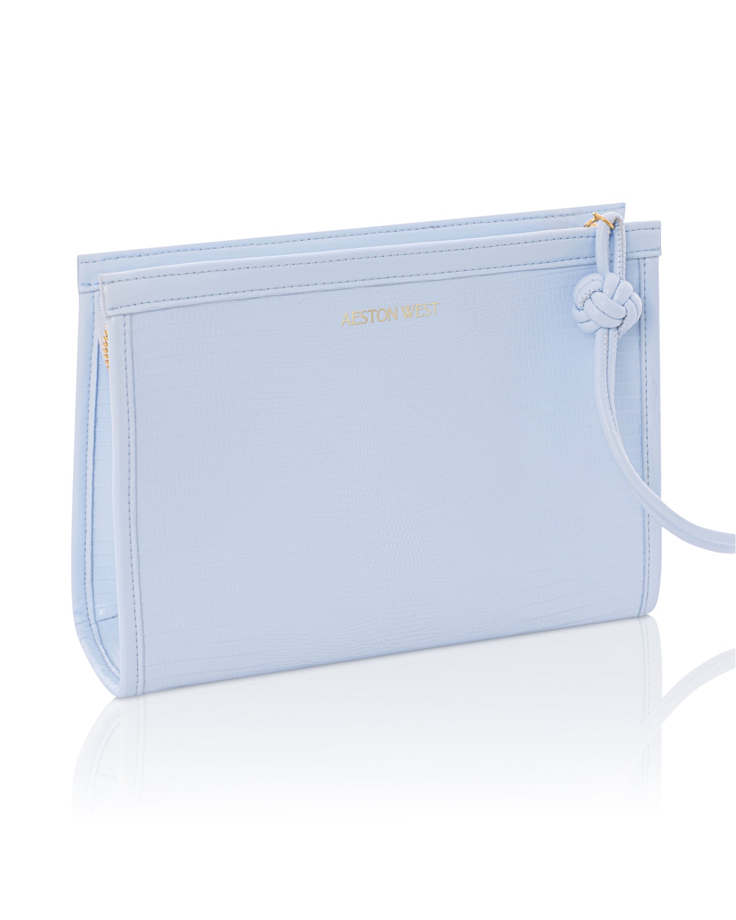 Crafted in ice blue vegan lizard leather with a deep blue wipeable nylon interior, this bag balances elegance and function. Room for the whole Aeston West ritual, plus whatever else the day demands. Finished with a gold-foiled logo and a knotted pull that doubles as a detachable keychain.