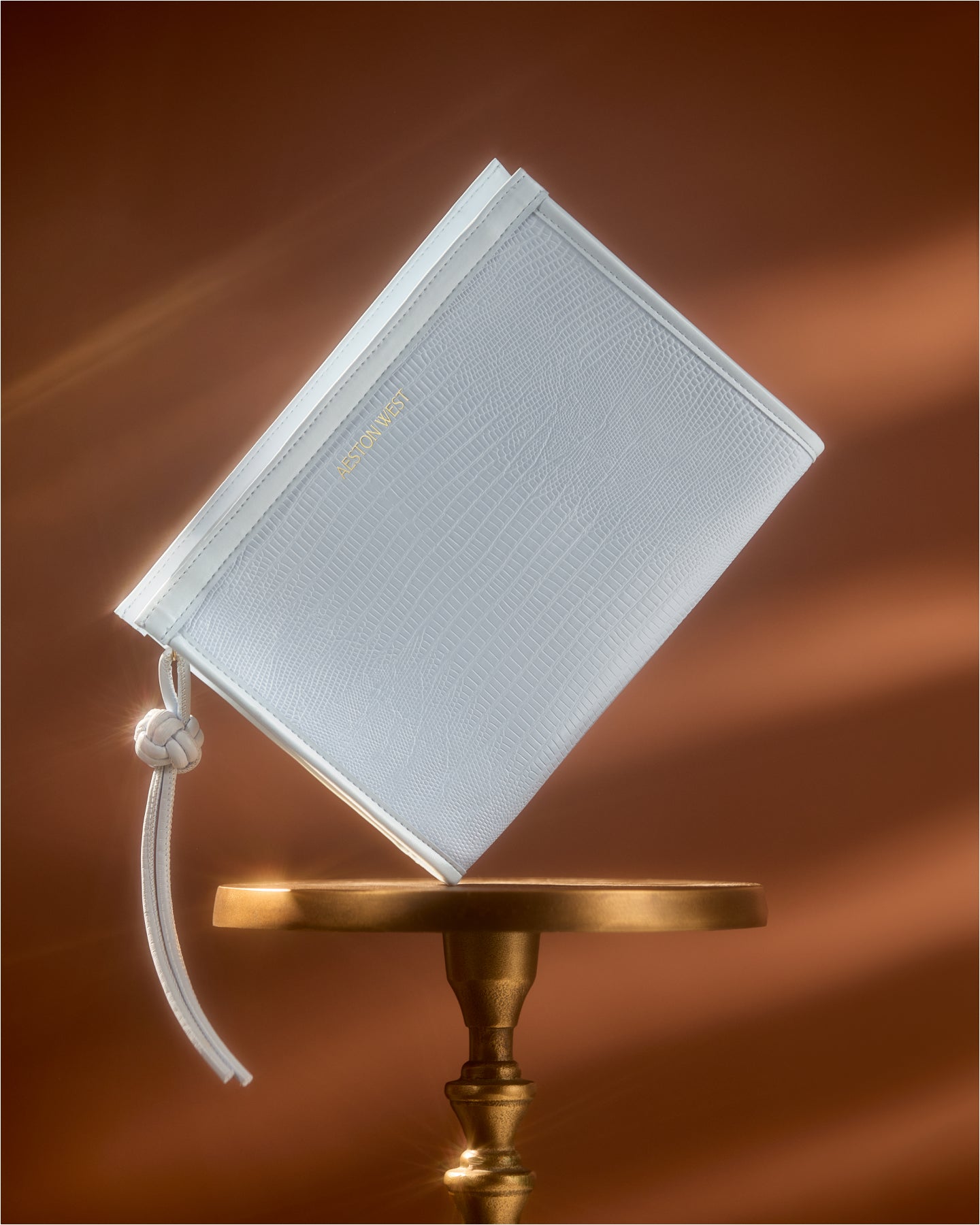Pack your Aeston West essentials (Discovery Kit, Cleansing Puffs, or full-size bottles). Zip securely with the knotted pull, remove the keychain when needed, and carry it inside your tote, suitcase, or in-hand as an elegant evening accessory.